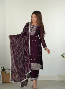 Designed for elevated ethnic wear, this Wine Rangoli Silk Kurta Set blends rich texture, flattering structure, and coordinated styling.