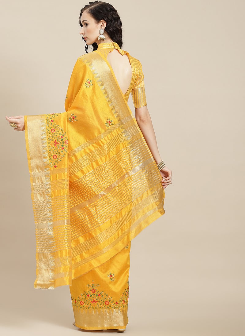Yellow Assam Cotton Silk Saree with Thread Embroidery