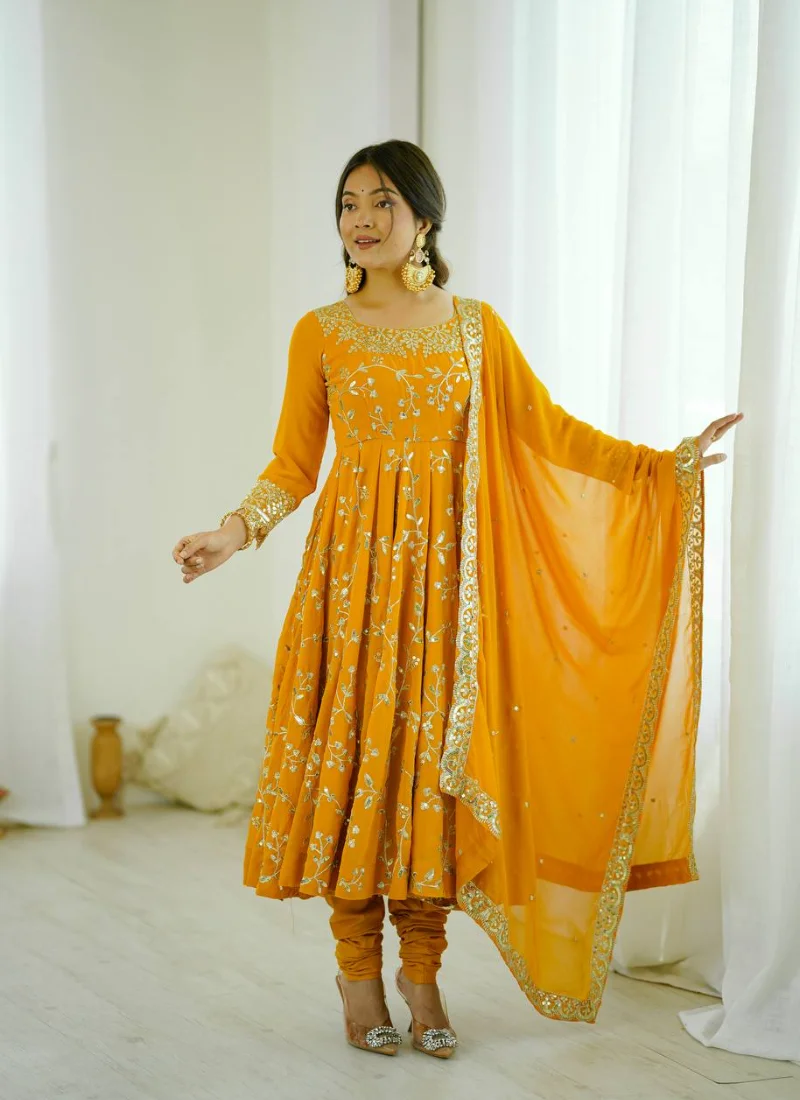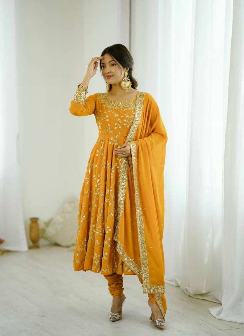 Created for celebrations and special gatherings, this Yellow Faux Georgette Gown Set offers a balanced mix of comfort, flow, and detail.
