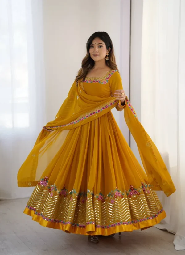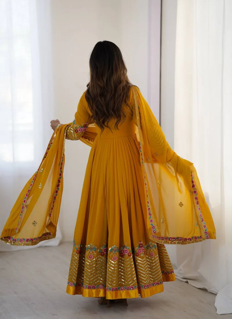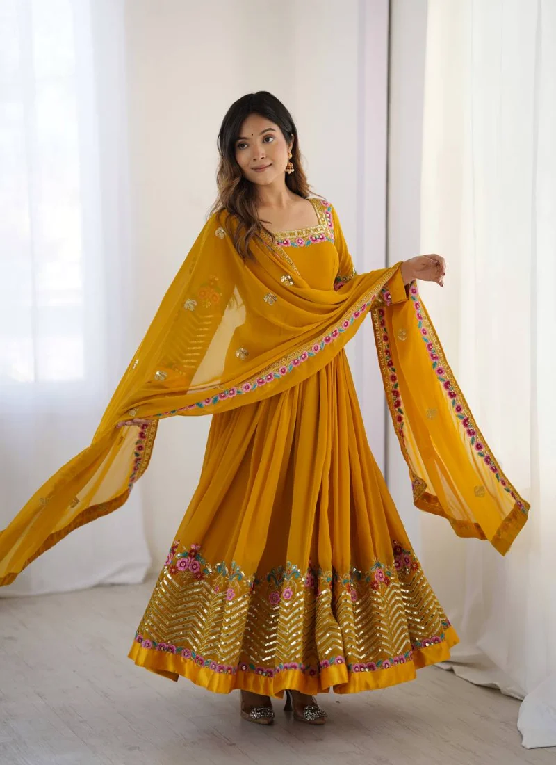 The Yellow Georgette with Suit Set is a versatile festive pick that pairs premium fabric with graceful movement and coordinated pieces.