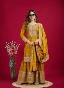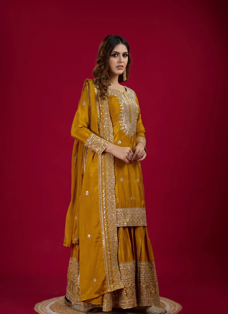 This chinnon silk sharara suit in Yellow is designed to bring a polished festive look with graceful movement and ready-to-wear comfort. Crafted with Pure Heavy Chinnon Silk with Embroidery and 5mm Sequence Work, featuring Full Sleeves, the coordinated set delivers a refined ethnic silhouette that works beautifully for celebrations, festive gatherings, family functions, and statement occasion dressing.