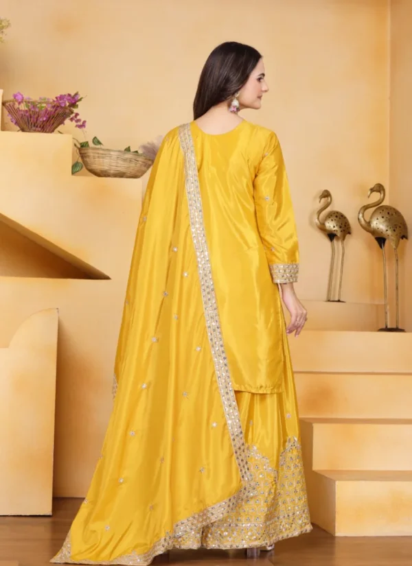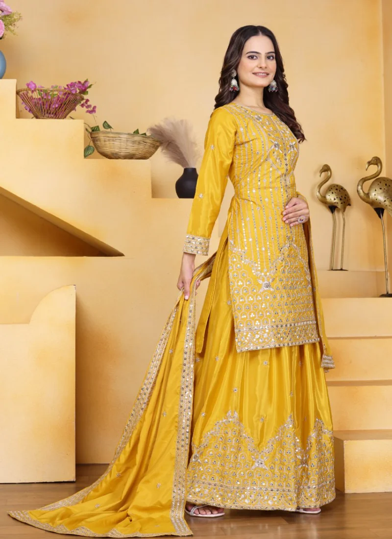 This Yellow Silk Embroidered Salwar Suit is a flattering wardrobe essential that blends premium fabric, polished detailing, and easy wearability.