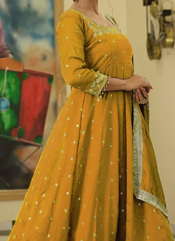 Crafted in Vichitra Silk, the set combines a flowy anarkali kurta with matching palazzo styling and dupatta coordination for a complete outfit. The embroidered finish and rich yellow tone make it a strong choice for festive functions, family celebrations, and party wear.